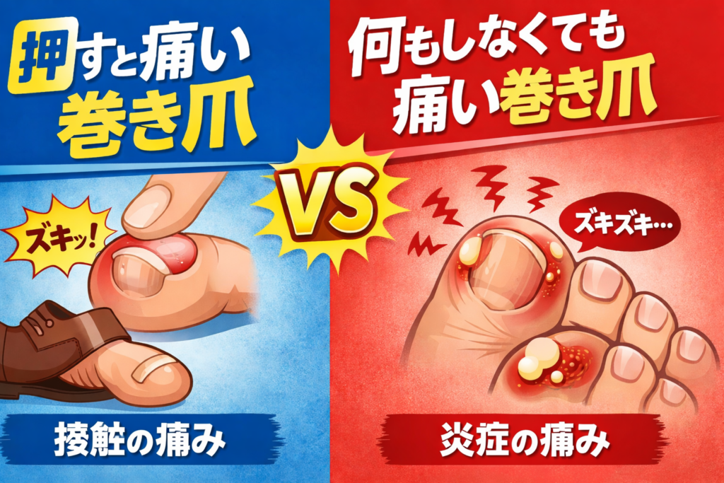 巻き爪・陥入爪は急に痛みが強くなる事もよくあります。