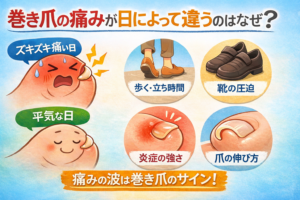 巻き爪の原因は複雑ですが、靴のサイズ感は非常に大きな要因です。津田沼で快適な生活を送るためには、自分に合った靴を選び、原因を理解したうえで生活習慣を見直すことが大切です。当院では施術だけでなく靴のアドバイスも行っていますので、津田沼で巻き爪に悩んでいる方はお気軽にご相談ください。