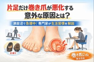 習志野市奏の杜や津田沼エリアは、通勤・通学で歩く機会が多く、靴による圧迫や足指の使い方のクセが原因で巻き爪が悪化しやすい環境です。
