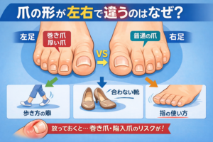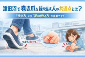 巻き爪は、爪の切り方だけで起こるものではありません。立ち仕事、歩き方のクセ、靴の形、体重のかかり方など、日常生活の積み重ねが大きく影響します。