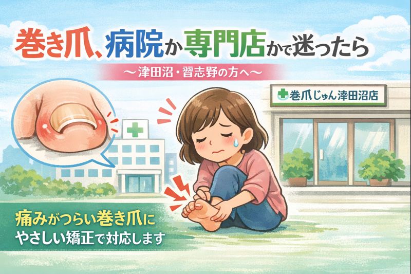 巻き爪は見た目以上につらい症状で、痛みが強くなると歩くこと自体が負担になり、日常生活にも大きな影響を与えます。今回は、病院と専門店それぞれの役割の違いを整理しながら、津田沼店の視点で分かりやすく解説します。